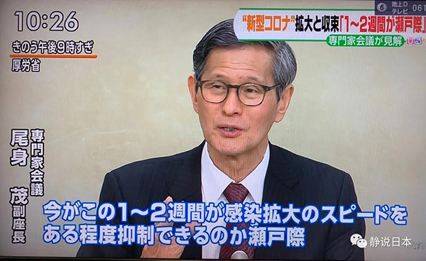 专家委员会副委员长尾身茂表示:“从新冠病毒的特征来看,日本要完全防止每个人不被感染是不可能的。但是,可以抑制感染扩大的速度。因此,接下来的1-2周将是决定疫情的关键时期。如果感染急速扩大的话,患者数量暴增,医护人员的感染风险就会增大,医疗体制有可能发生崩溃,社会经济活动的混乱也有可能加深。”