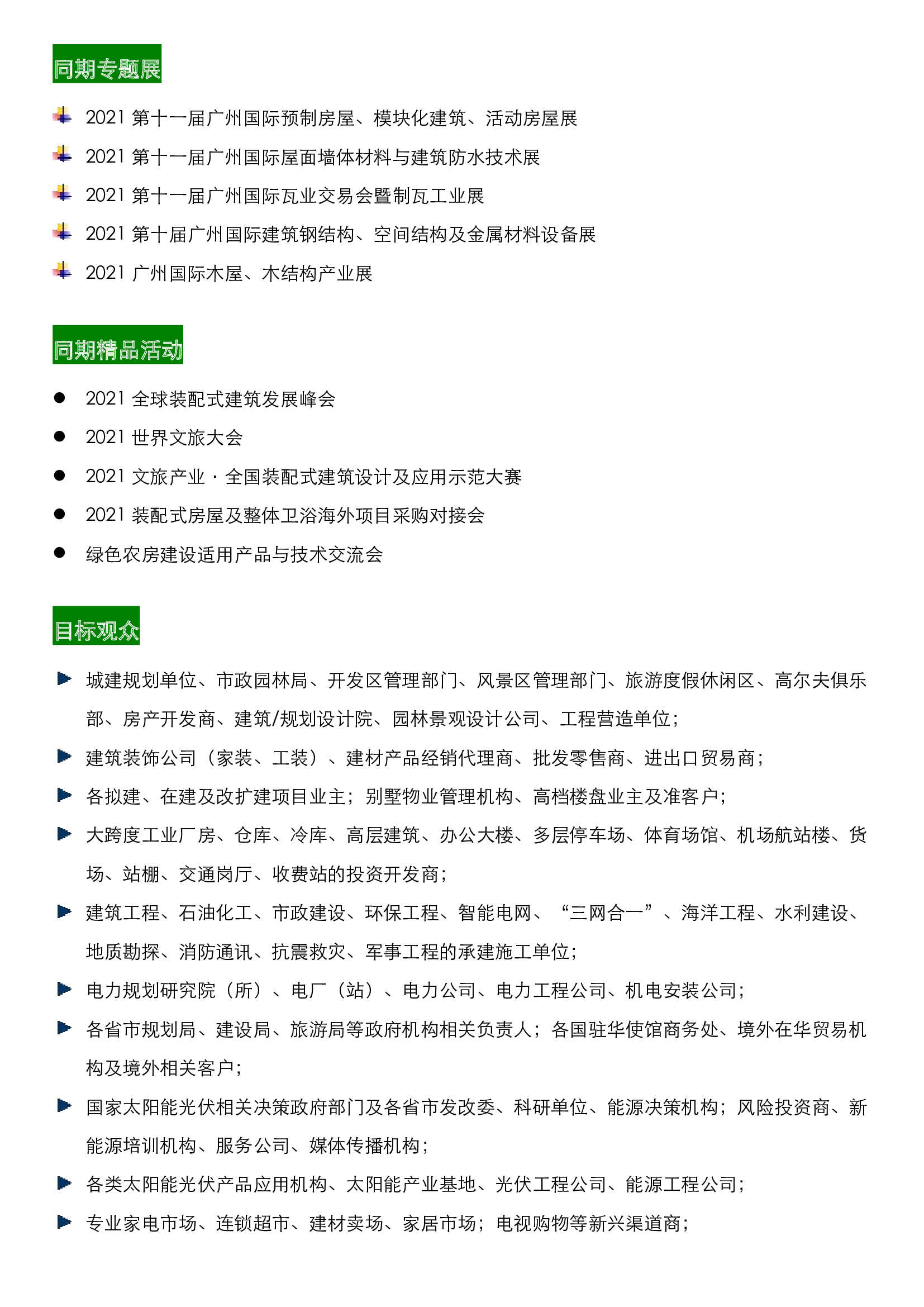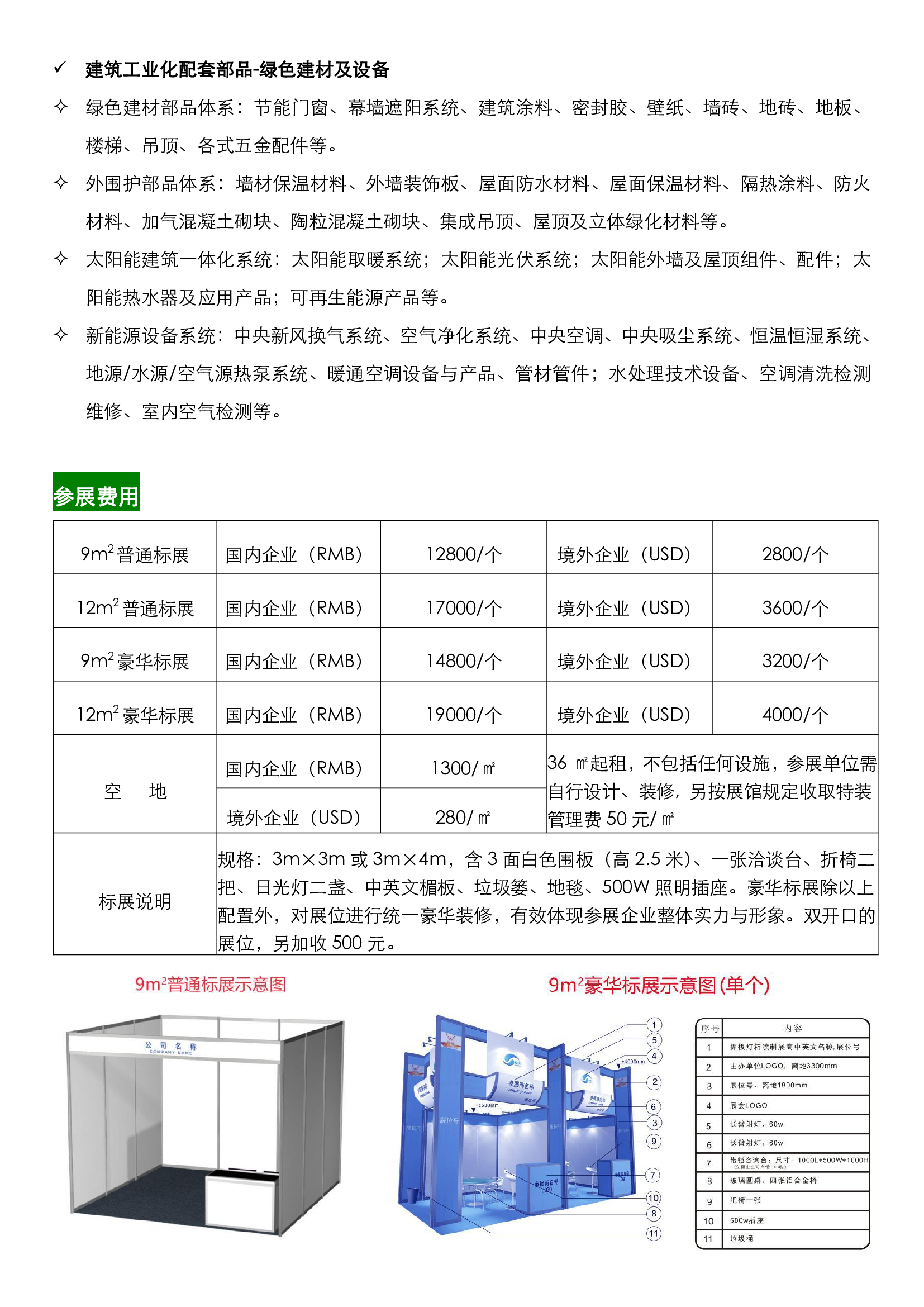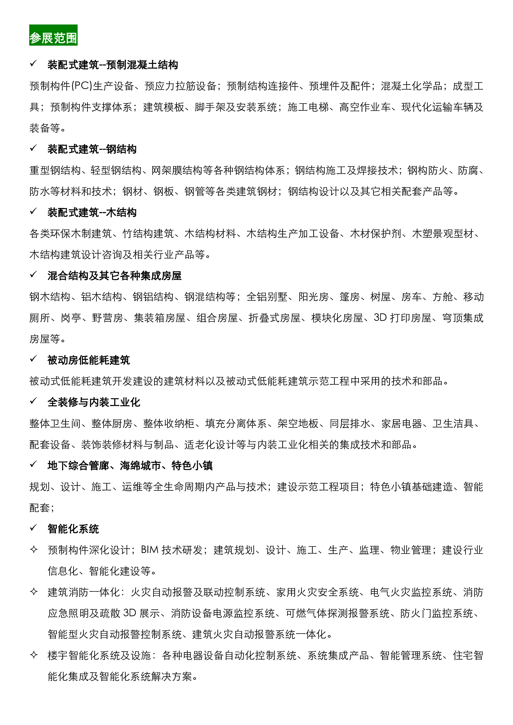 展品内容:工程总承包项目、混凝土预制件、钢结构模块化房屋、轻钢别墅、铝制别墅、集装箱房、木屋、木塑集成房屋、阳光房、帐篷酒店、遮阳棚、景观膜结构、园林庭院、移动厕所、别墅配套、全装修与内装工业化、屋面瓦、墙体材料、防水材料、密封胶、墙板设备、彩钢设备、制瓦设备、设计软件……