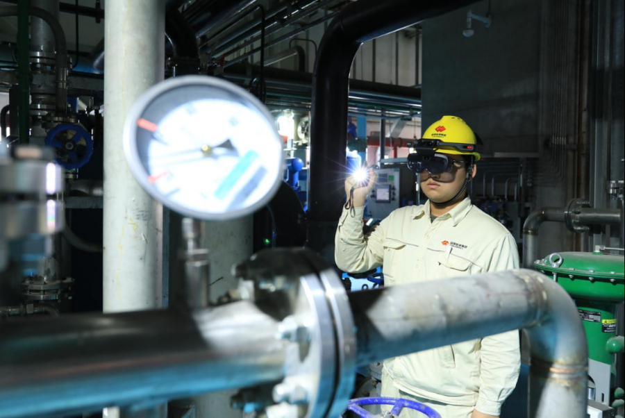 图为国神准东公司运行人员佩戴AR智能头盔在汽机房执行巡检任务