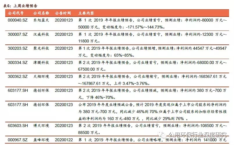 截至2020年2月2日,我们研究的78家环保上市公司中已经有42家披露2019年年度业绩预告。发布业绩预告的公司中,净利润为正且同比增长的有28家(其中6家2018年净利润为同比下降),其中同比增幅上限超过100%的有3家,30%-100%之间有8家,0%-30%的有12家,扭亏为盈的有5家;净利润为正但同比下降的公司有8家;出现亏损的公司有6家,其中首次亏损的有5家。